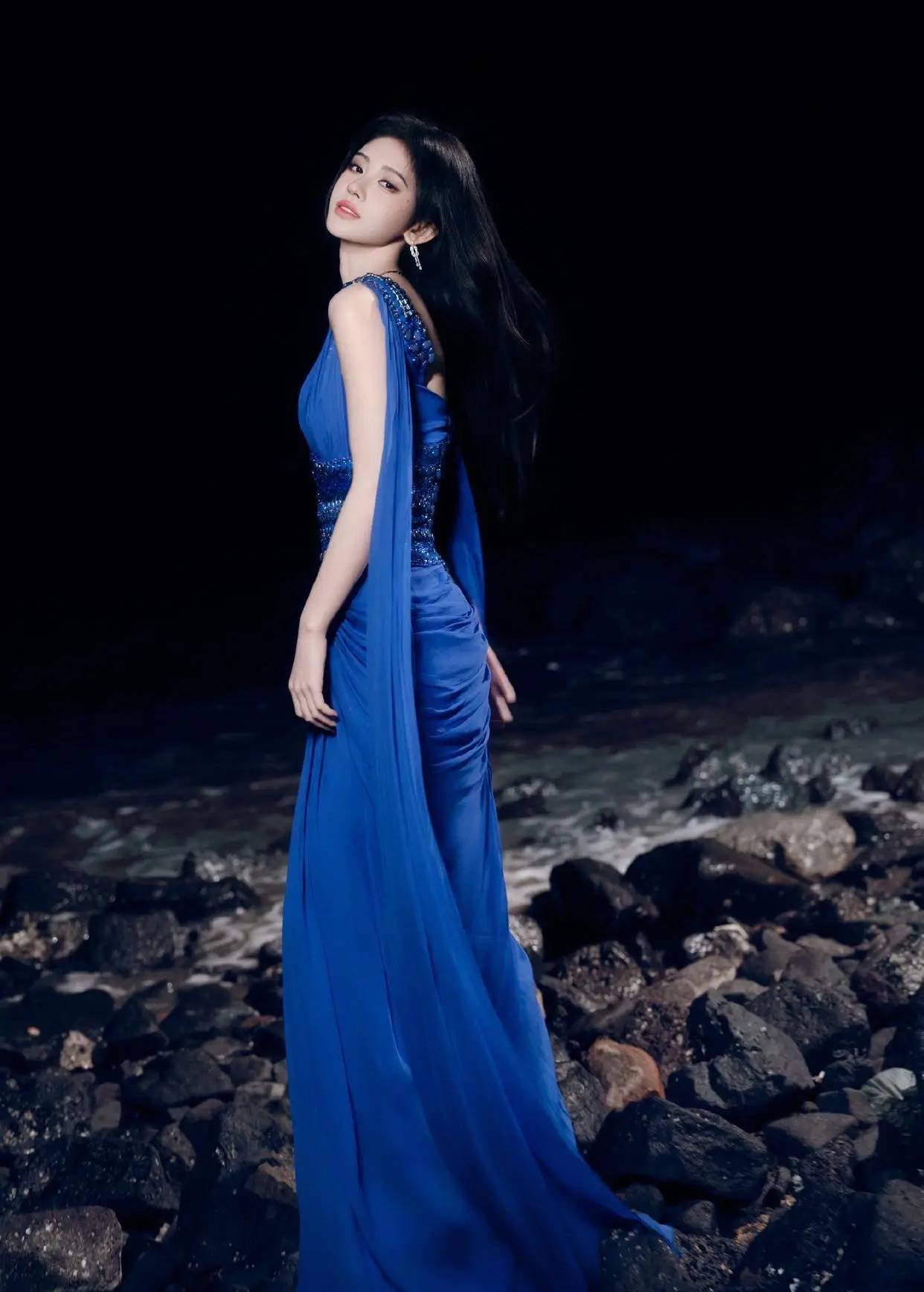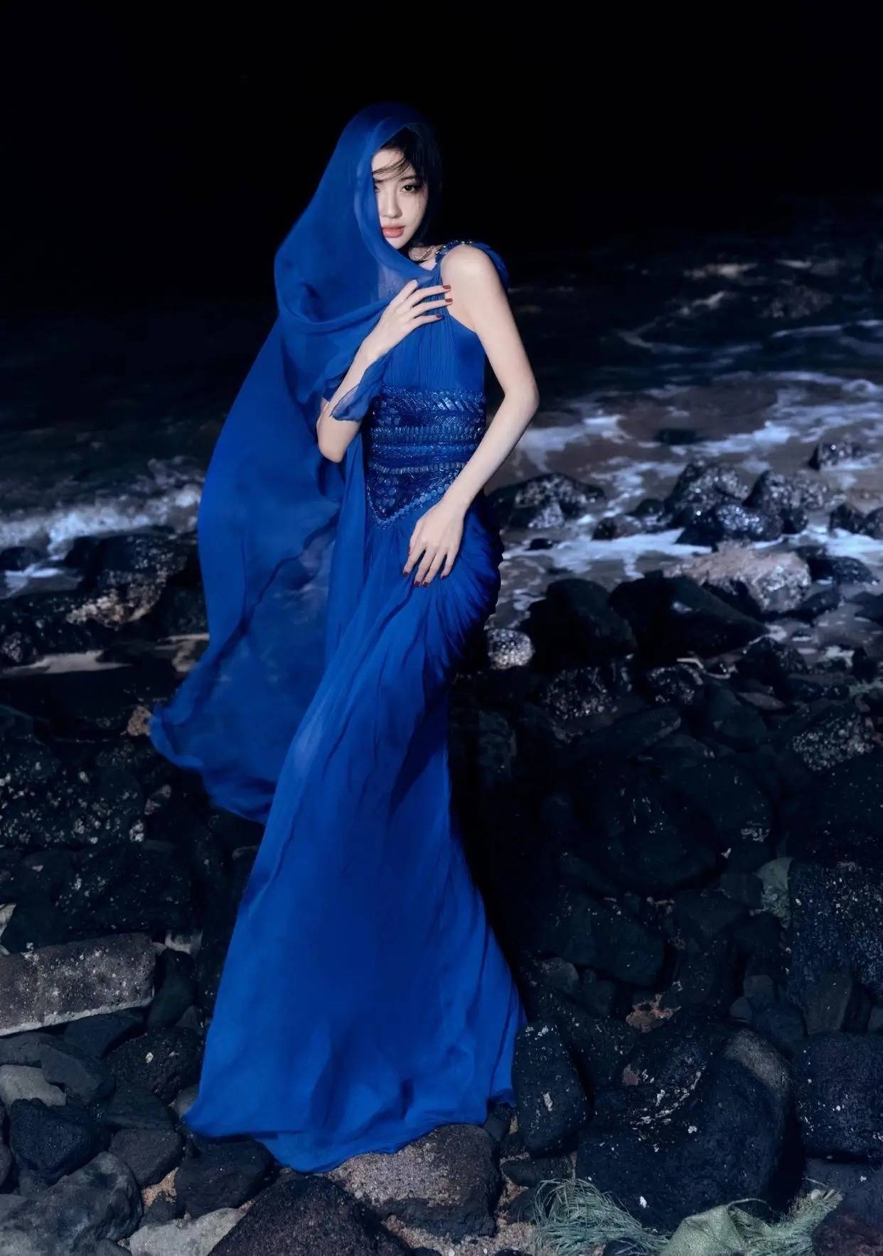 先看这套蓝纱裙的细节:斜裁的领口刚好卡在锁骨下方,拉长了脖颈线条;腰间的钉珠带比裙摆深一个色号,视觉上直接把腰线往上提了三公分,再配上垂到脚踝的纱裙,腿长直接从腰开始算。她站在礁石上时,裙摆随着海风往后飘,肩背的线条和裙摆的弧度形成呼应,哪有半分 “显壮” 的影子?