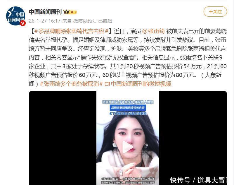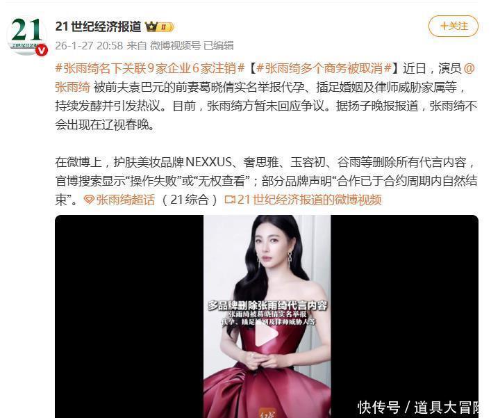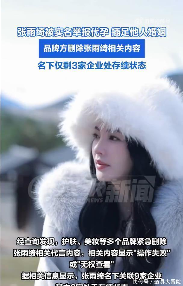 商业代言“地震”的后果立竿见影。据公开资料,张雨绮的短视频广告报价在54万至80万元不等,名下关联的9家企业中仅有3家尚在存续。如今,随着品牌方集体撤离,这条重要的收入渠道已被实质性冻结。不仅如此,其原定的巴黎时装周行程已被取消,辽宁卫视春晚也因网友大规模抵制“劣迹艺人不宜登台”而删除了她的节目并关闭评论区。就连其常驻的综艺《女子推理社3》,也网传将由他人顶替,节目组已删除相关宣传物料。