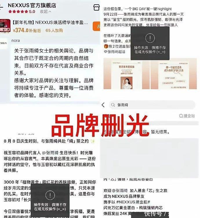 这边厢争议还在发酵,那边厢商业世界的反应堪称“光速”。护肤美妆品牌们仿佛接到了统一指令,集体上演“删除术”。NEXXUS、奢思雅、玉容初、谷雨等品牌纷纷清空所有与张雨绮相关的代言内容,官博搜索结果显示“操作失败”或“无权查看”,场面一度十分尴尬。