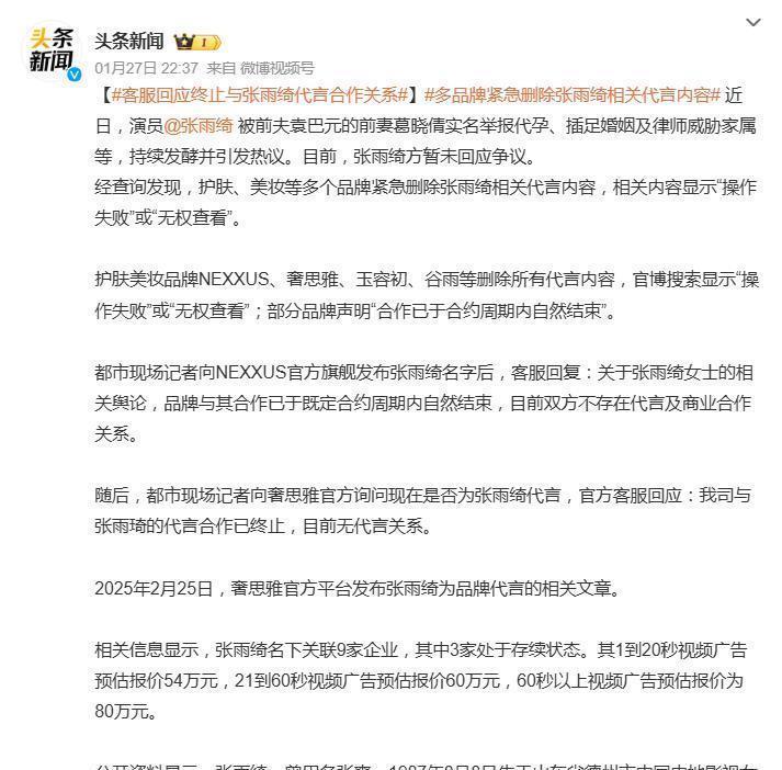 品牌方的客服回应更是“火速切割”的标准模板。NEXXUS客服明确表示,合作“已于既定合约周期内自然结束”;奢思雅客服也直接确认“代言合作已终止”。颇具讽刺意味的是,就在风波爆发前不久的2025年2月25日,奢思雅官方还曾发布张雨绮的代言文章。这波“前脚官宣,后脚删除”的操作,将品牌面对艺人负面舆情时的避险心态暴露无遗。