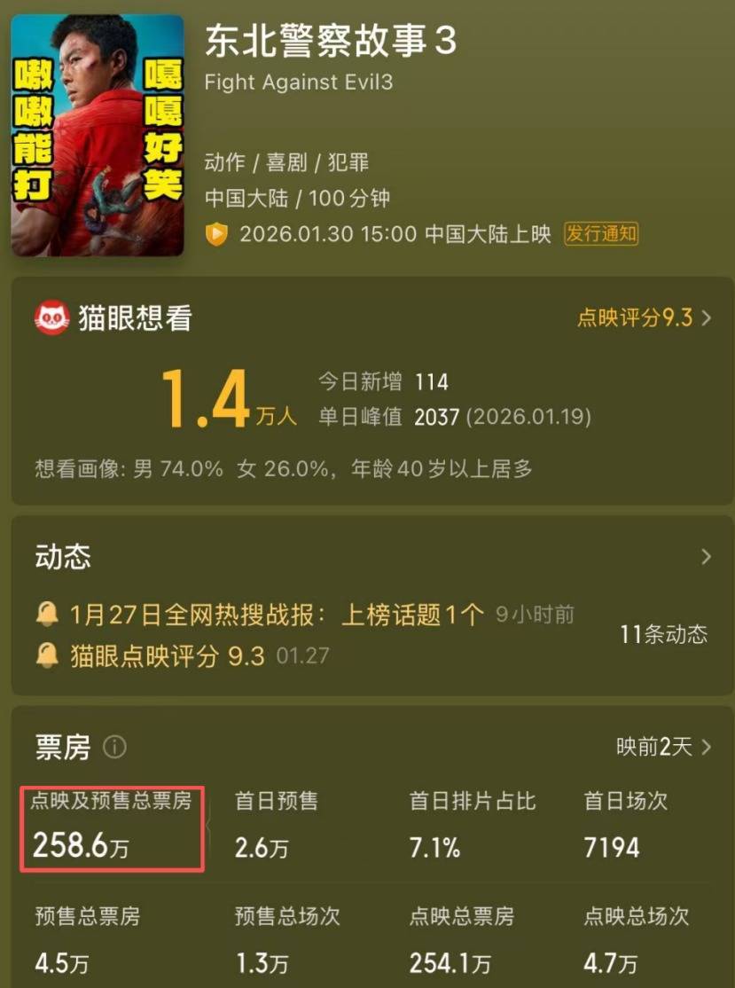 提起这个IP,想必很多人都不陌生。《东北警察故事》系列前两部以网大形式播出,播放量破亿。第一部成本仅800万,却斩获2000万分账票房,第二部分账票房高达3000万,堪称“网大天花板”。因此,第三部对谢苗来说,是在院线站稳脚跟的关键一战。目前来看,结果令人欣喜。影片一开始排片不多,宣传也少,点映首日票房仅20万,但随着口碑传播,票房实现逆袭,24日和25日连续逆跌,五天斩获258万票房。所以我断定,等影片口碑发酵,正式上映后排片增加,票房定会迎来小爆,谢苗勇闯院线初战告捷!而看完影片,我被谢苗的表现惊艳到,甚至觉得他能接替李连杰,扛起华语动作片大旗!