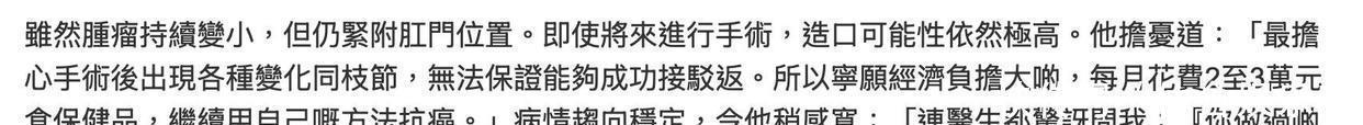 被称作TVB“反派专业户”的绿叶演员彭皓锋三年前查出得了三期直肠癌,当时他直接停下手头工作去治病。因为肿瘤长在肛门附近,他实在不想把肛门切掉,就选了保守疗法,医生也没别的招,只能让他定期复查。虽说选的是保守治法,但彭皓锋觉得自己挺走运,这几年肿瘤没变严重,反而慢慢变小了,病情好转让他又惊又喜。现在他已经重新开始工作了,毕竟他经济压力挺大,还得为以后的日子打算。